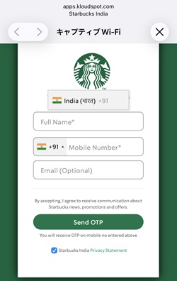 インドのスターバックスでは無料Wi-Fiのアクセスポイントに接続するとキャプティブポータルでインドの電話番号(+91)が求められる。入力した電話番号にワンタイムパスワード(OTP)がSMSで送られてくるため、入力したインドの電話番号でSMSが受信できる必要もある。